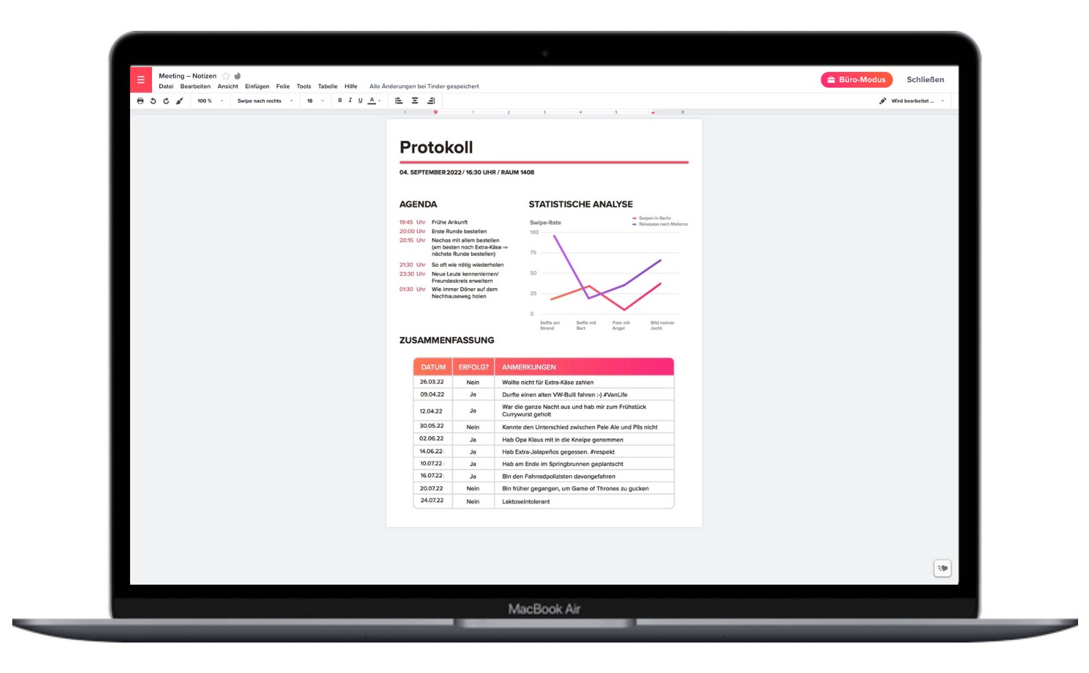 Wenn mitten im Flirt plötzlich Kollegen oder der Chef um die Ecke kommen, dann lässt sich in der Browser-Version von Tinder einfach auf das Aktenkoffer-Symbol in der oberen linken Ecke klicken. Klickt man auf dieses Symbol, dann erscheint auf dem Bildschirm sofort ein Scheinprotokollbericht mit Agenda, statistischer Analyse und Zusammenfassung, der die Situation entschärfen soll.