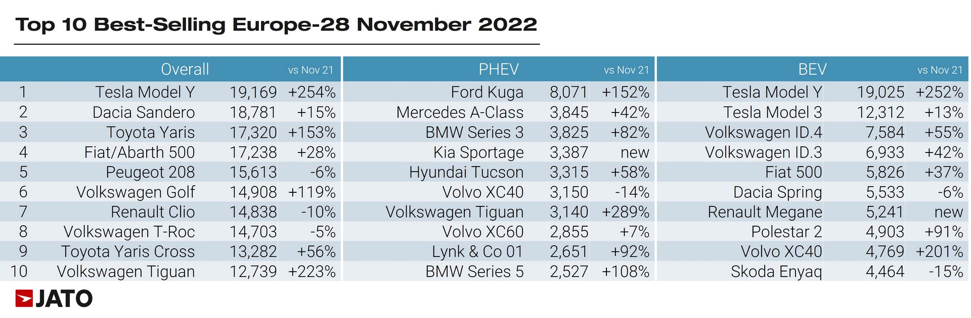 Im vergangenen Monat erzielte Tesla einen Volumenanstieg von 93 Prozent, während der US-Hersteller seinen Anteil am BEV-Markt von 12,3 Prozent im November 2021 auf jetzt 18,9 % steigern konnte. Das Wachstum von Tesla habe sich in Europa trotz neuer Konkurrenten aus China beschleunigt, und seine Führungsposition auf dem europäischen BEV-Markt weiter zementiert, kommentiert Jato die Automarktzahlen für Europa.