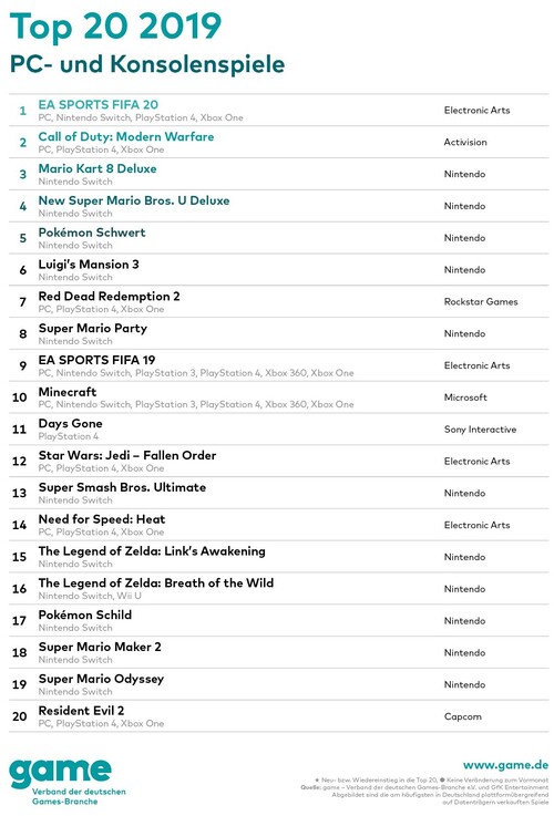 Ein Jahr zuvor konnte bereits "FIFA 19" den Spitzenplatz erobern, das in den Jahres-Charts 2019 immerhin noch auf dem 9. Platz landet. "Call of Duty: Modern Warfare" sicherte sich 2019 den 2. Platz noch vor "Mario Kart 8 Deluxe" (Nintendo). Auf den weiteren Plätzen folgten die Nintendo-Titel "New Super Mario Bros. U Deluxe", "Pokémon Schwert" und "Luigi’s Mansion 3".