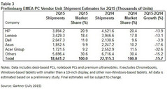 Im Wirtschaftsraum EMEA betrug das Gesamtliefervolumen im 2. Quartal 2015 insgesamt 18,64 Millionen Desktops, Notebooks und Premium Ultramobiles. Das entspricht einem satten Minus von 15,7 Prozent. Bei den Top-5-Herstellern heißen auch hier die ganz klaren Verlierer Acer und Asus. Im Vergleich Q2/2014 und Q2/2015 stürzte das Liefervolumen bei Acer mit minus 32,6 Prozent regelrecht ab. Auch Asus (- 17,7 Prozent), HP (- 13,9 %) und Lenovo (- 13,1 %) haben massiv an Substanz im EMEA-Raum verloren. Alleine Dell schaffte den Lieferrückgang mit minus 3,9 Prozent einzudämmen.