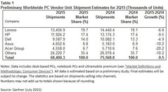 Als 3 Hauptgründe für die Talfahrt auf dem PC-Markt machten die Marktanalysten die höheren Preise für Rechner in verschiedenen Ländern und Regionen wegen des starken US-Dollars, ausbleibende Innovationen bei Soft- und Hardware und das Warten auf Windows 10 aus. Im Top 5 Ranking der weltweit größten PC-Hersteller behielt Lenovo die Nase als Nummer 1 vorne. Dahinter folgen auf den Plätzen 2 bis 5 Hewlett-Packard (HP), Dell, Asus und Acer. Alle Hersteller verkauften im Vergleich zum Quartal des Vorjahreszeitraum deutlich weniger PCs. Allen voran Acer und Asus.