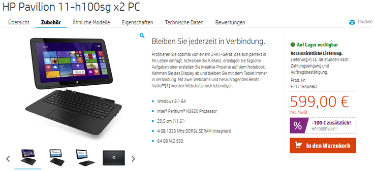 - HP Store: HP Pavilion 11-h100sg x2 für 499,00 € (mit Gutscheincode: HP100EPVLN11)