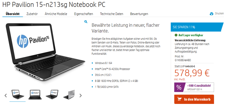 - HP Store: HP Pavilion 15-n213eg für 479,00 € (mit Gutscheincode: HPSNAP10014)