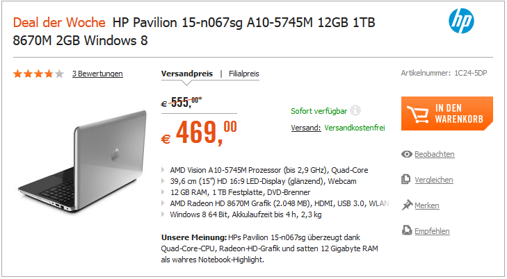- Cyberport: HP Pavilion 15-n067sg für 469,00 €
