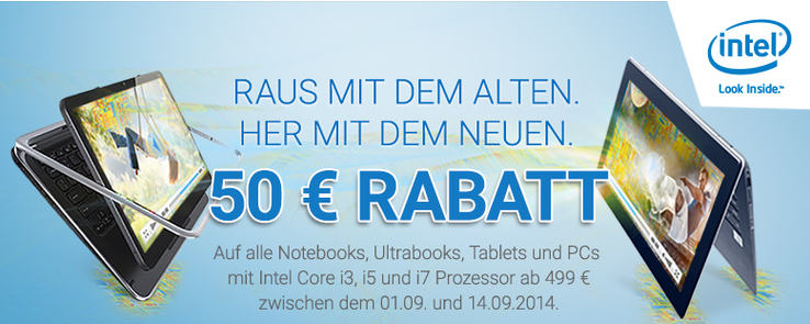 - Notebooksbilliger: Rabatt-Gutschein im Wert von 50 €. Kann für den Kauf eines Notebooks, PCs, Tablets mit Intel Core i3, i5 und i7 Prozessor ab 499 € eingesetzt werden.