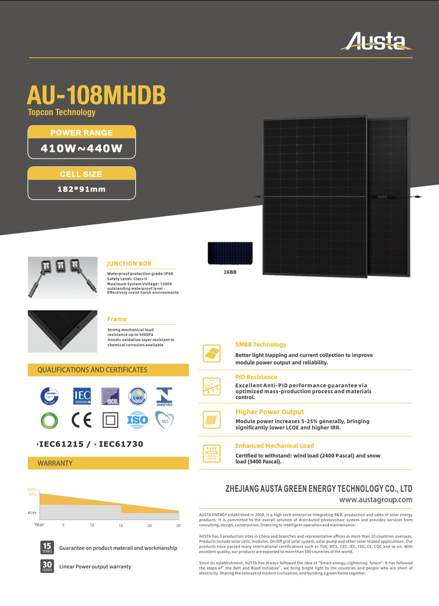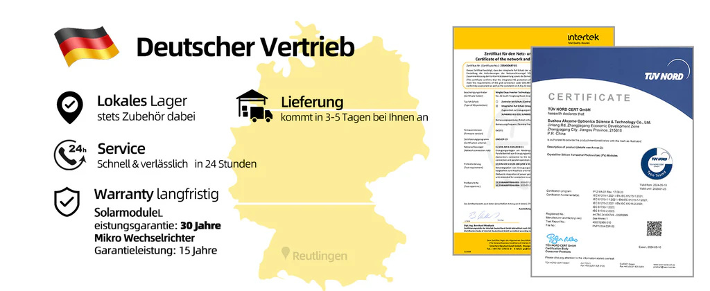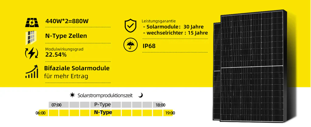 Die beiden Solarmodule mit einer Leistung von jeweils 440 Wp und den Maßen 1.722 x 1.134 x 30 mm bieten eine Produktgarantie von 15 Jahren und eine Leistungsgarantie von 30 Jahren. Zum Lieferumfang gehört außerdem ein Deye-Wechselrichter SUN-M60/80/100G4-EU-Q0, der ab Werk eine Ausgangsleistung von 800 W hat, über zwei Eingangskanäle und unabhängige MPPT-Tracker verfügt. Ein Kabel ist ebenfalls enthalten und die Garantiezeit für den Wechselrichter beträgt 15 Jahre.