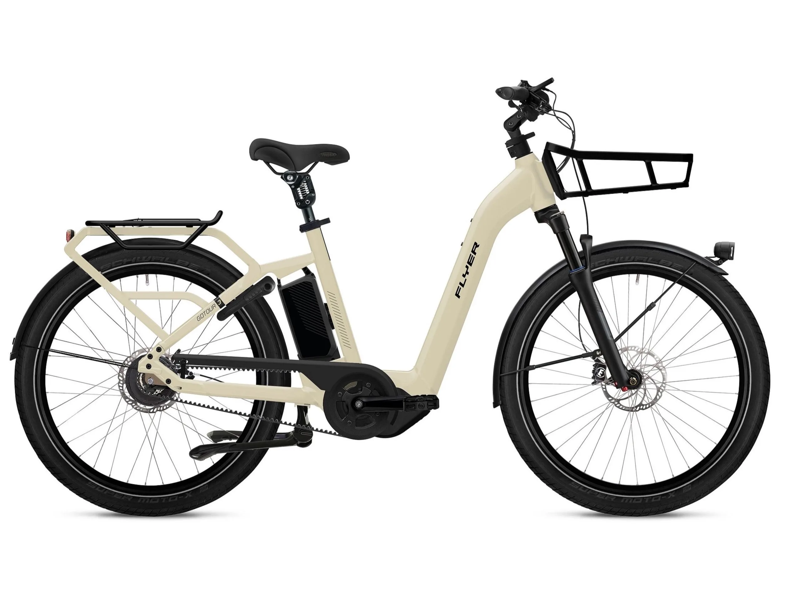 Es kommt ein Panasonic GX Power Plus-Motor zum Einsatz. Der Mittelmotor unterstützt bis zu einer Geschwindigkeit von 25 km/hund bringt es auf ein Drehmoment von 75 Nm. Die Kraftübertragung erfolgt mithilfe eines Carbonriemen von Gates und nicht einer klassischen Kette, dabei fehlt eine Schaltung aber trotzdem nicht - diese bietet fünf Gänge. Magura MT5-Scheibenbremsen sind verbaut. Eine SR Suntour MobiE 45 Air-Federgabel mit einem 60 Millimeter langen Federweg soll auch für einen hohen Fahrkomfort sorgen.