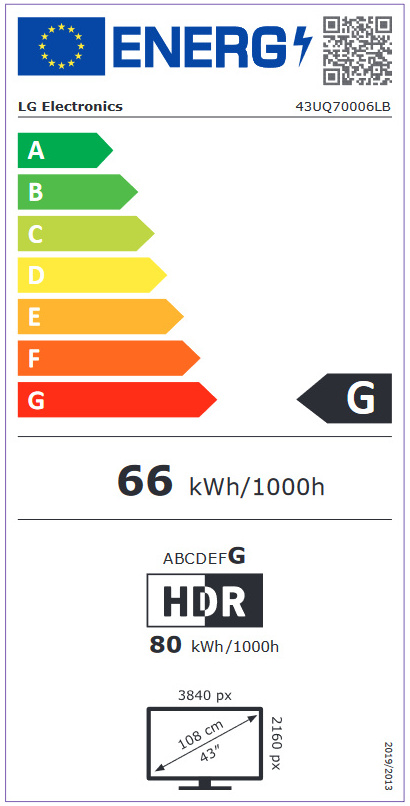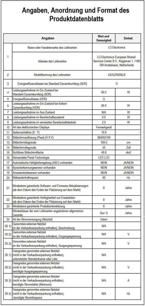 LG beziffert das Gewicht des 43-Zoll-Fernsehers inklusive Standfuß mit 7,2 Kilogramm. Beim Thema Energieverbrauch nennt LG für den 43UQ70006 eine durchschnittliche Leistungsaufnahme von 66 kWh/1000 h sowie 80 kWh/1000 h bei HDR-Betrieb. Im Standby genehmigt sich der LG-TV noch knapp 0,5 Watt.