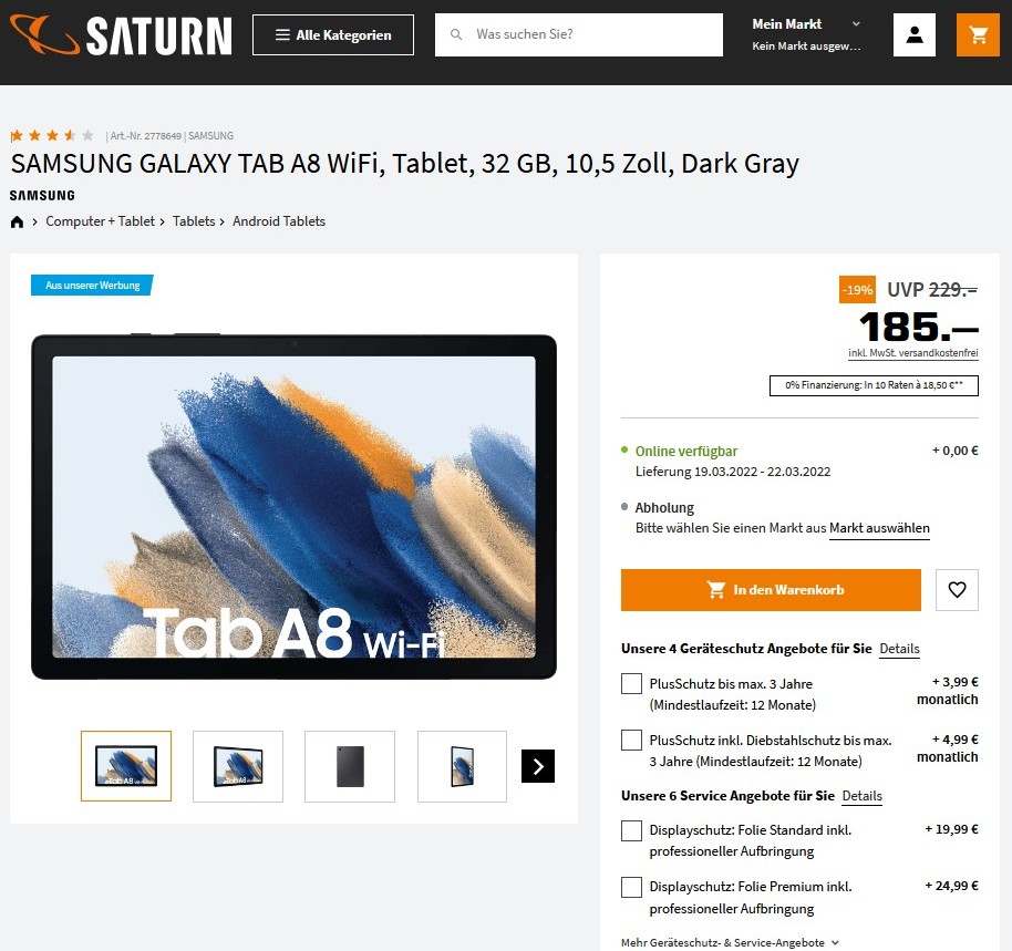Inzwischen haben andere Anbieter wie Amazon und Coolblue preislich nachgezogen. Amazon gewährt ebenfalls 19 Prozent Rabatt auf das Samsung Galaxy Tab A8 für das Basismodell mit 8/32 GB Speicher und nennt aktuell einen Preis von 184,99 Euro. Der Versand des Samsung-Tablets ist beim Amazon-Deal ebenfalls kostenlos inbegriffen. Zusätzlich ist der Rücksendung des Tablets für den Fall einer Reklamation bei Amazon ebenfalls gratis.