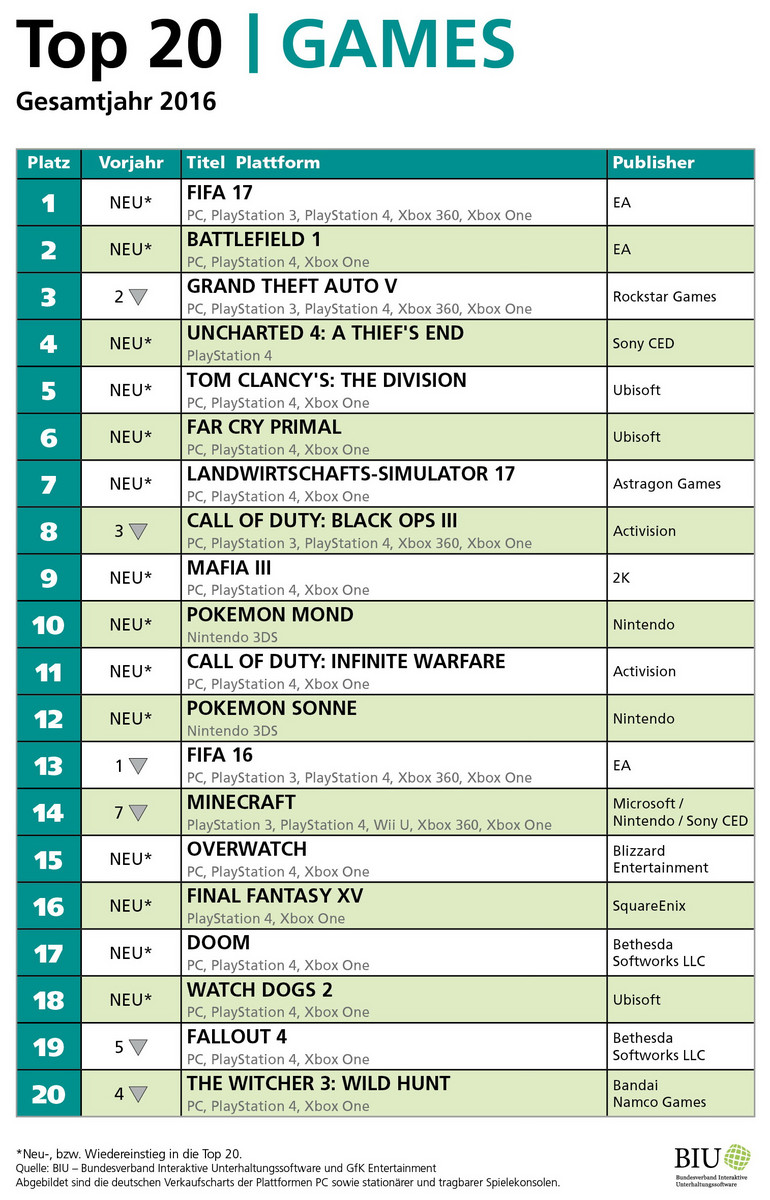 "2016 war ein besonders spannendes Jahr für alle Gamer: Mit ,Doom‘ und ,Final Fantasy‘ kamen nicht nur neue Titel großer Spiele-Serien auf den Markt, sondern mit ,Overwatch‘ und ,Tom Clancy’s: The Division‘ auch komplett neue Marken. Mit Blick auf die meistverkauften Spiele wird dabei deutlich, dass insbesondere Mehrspieler- und Open-World-Spiele bei den Gamern sehr beliebt waren. Hier bieten sich einmalige Erfahrungen, gemeinsam und gegeneinander zu spielen sowie sich frei in offenen Welten bewegen zu können und dabei seine ganz eigene Geschichte zu erleben."