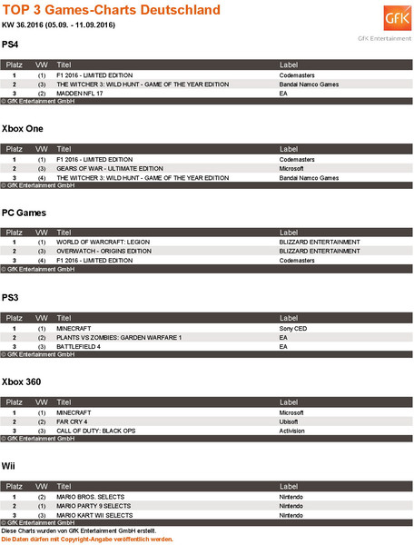 In der Kalenderwoche 36 (5. bis 11. September 2016) gab es in den Games-Charts der GfK Entertainment erneut jede Menge Bewegung. Bei den PC-Spielen behauptet sich einmal mehr Blizzard mit seinem MMORPG-Blockbuster World of Warcraft: Legion auf Platz 1. Dahinter folgt in KW 36 auf Platz 2 der Sci-Fi-Multiplayer-Ego-Shooter Overwatch des US-amerikanischen Computer- und Videospielentwicklers.