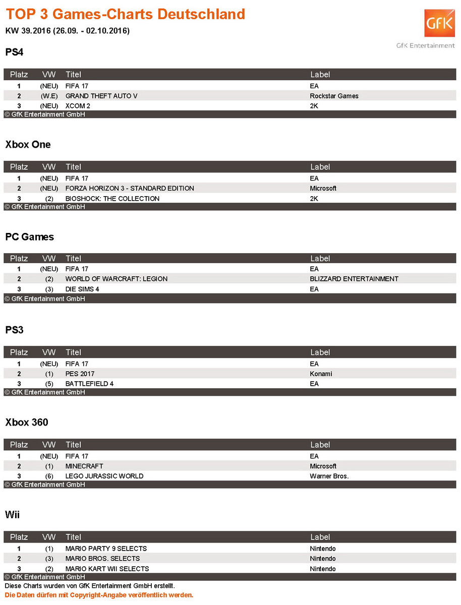 Die 24. Auflage der Fußball-Reihe kickt sich als FIFA 17 auf Anhieb an die Spitze der Spiele-Charts. Und das in den Games-Charts für PC, PS4, Xbox One, PS3 und Xbox 360. Die zweite Position besetzen World of Warcraft: Legion für den PC, Grand Theft Auto V auf PS4, Forza Horizon 3 - Standard Edition für die Xbox One, PES 2017 (PS3) sowie der Klassiker Minecraft auf der Xbox 360.