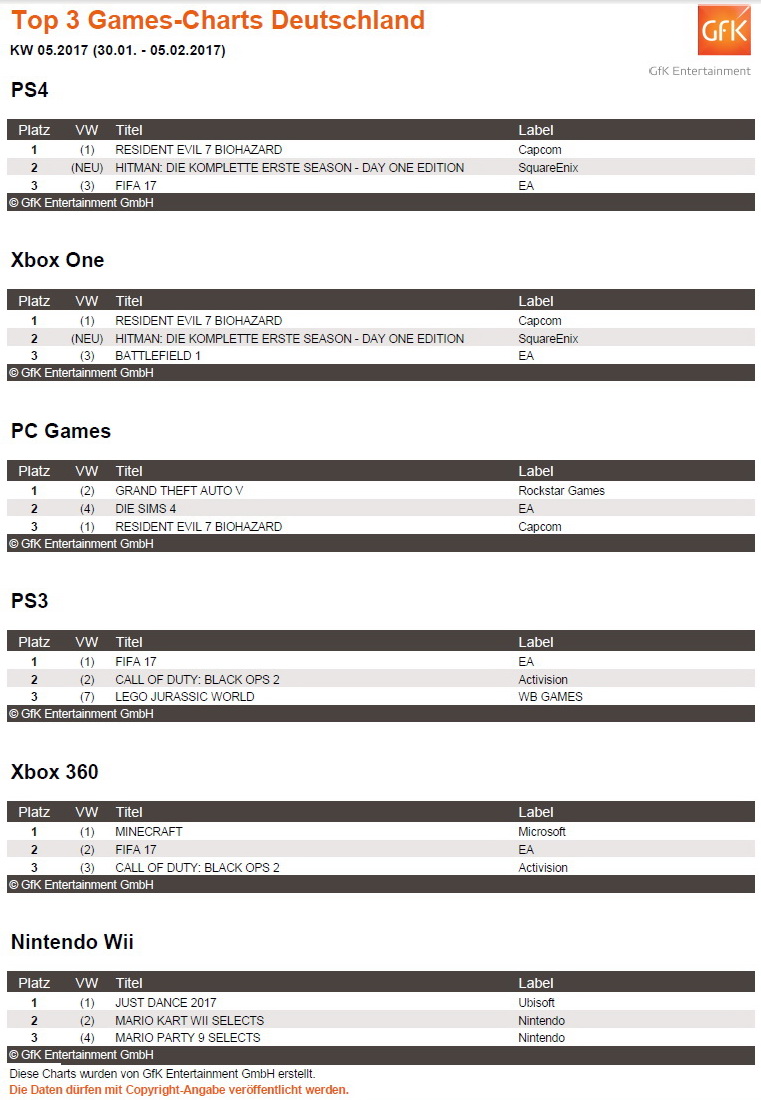 Für Anhänger und Fans von PS3 und Xbox 360 bleibt hingegen alles beim Alten: FIFA 17 und Call Of Duty: Black Ops 2 respektive Minecraft und FIFA 17 halten ihre Stellung. Auf Nintendo Wii lassen sich Just Dance 2017 und Mario Kart Wii Selects ebenfalls die Butter nicht vom Brot nehmen.