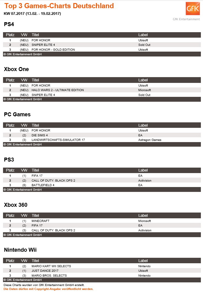 Es war einiges los, in den offiziellen deutschen Games-Charts der Woche 07.2017 (KW 7), die jede Woche von der GfK Entertainment ermittelt werden. In den Games-Charts gab es den Ritterschlag für das Mittelalterepos "For Honor".