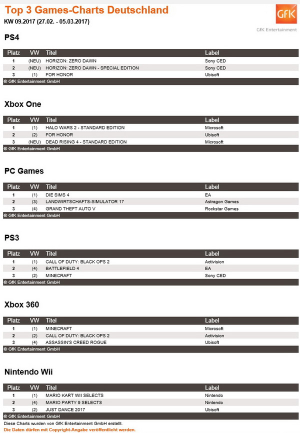 Horizon: Zero Dawn läutete mit dem Launch die Jagdsaison auf gigantische Roboter-Dinosaurier ein. Den riesigen Ungetümen gilt es, mit Pfeil und Bogen beizukommen. Mit dem postapokalyptische Actionspiel landet Sony Interactive Entertainment einen Volltreffer. Die Standard-Variante übernimmt die Spitze, während Special und Collector's Edition die zweite respektive vierte Stelle einnehmen. Die Nummer 1 der letzten Woche For Honor bleibt auf dem Bronzeplatz in Lauerstellung.