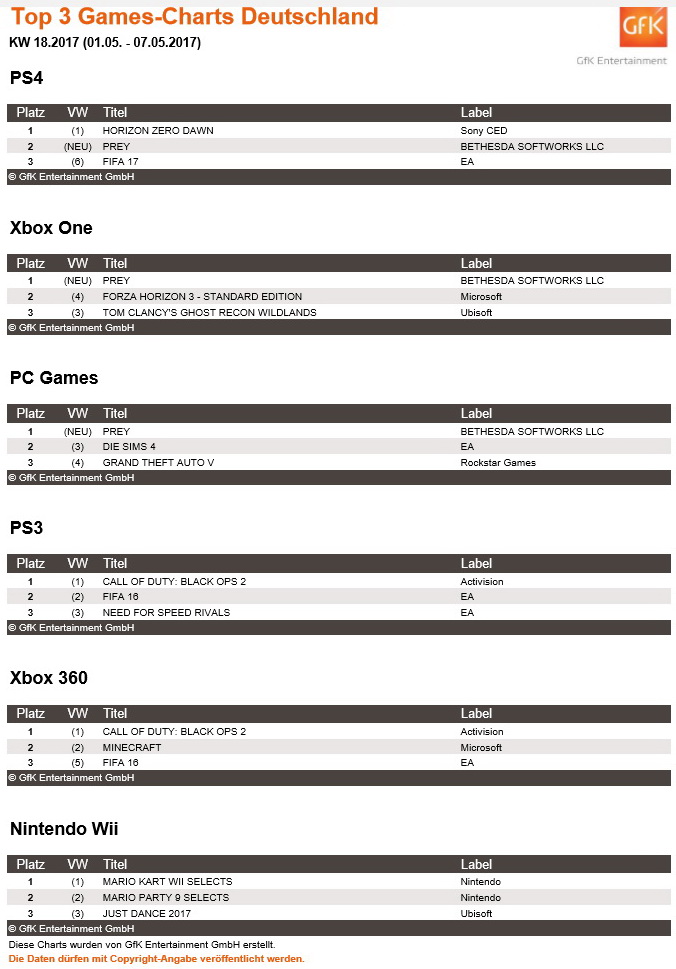 Auf der Xbox One geht der Abstauber der Vorwoche, Sniper: Ghost Warrior 3 - Season Pass Edition an sechster Stelle in die Defensive über. Forza Horizon 3 - Standard Edition schaltet zwei Gänge höher und muss sich nur dem neuen Bestseller Prey geschlagen geben. Bei den übrigen Spitzenreitern Call of Duty: Black Ops 2 (PS3, Xbox 360) und Mario Kart Wii Selects (Nintendo Wii) ändert sich bei der Platzierung nichts.