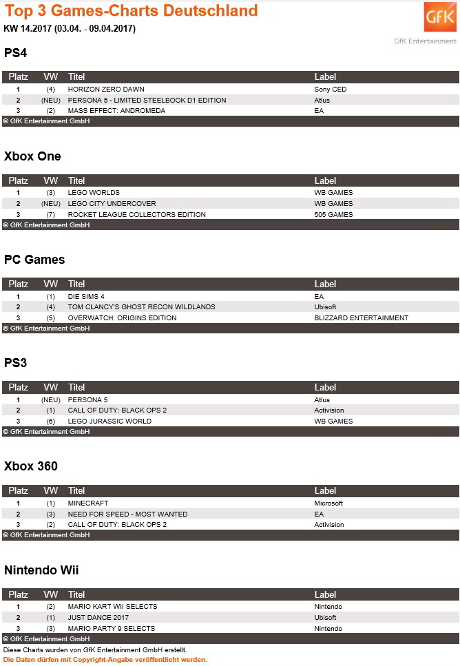 Das Japan-RPG Persona 5 wird gerade auch von den Kritikern abgefeiert und holt sich mit geiler Grafik, Inszenierung sowie Kreativität und mit der Geschichte über eine Gruppe von Highschool-Schülern, die ein geheimnisvolles Doppelleben führen, Platz 1 der offiziellen deutschen Charts für die PS3. Call Of Duty: Black Ops 2 tritt nach sechs Wochen den Rückzug an die zweite Stelle an. Auf der PS4 landet Persona 5 auf den Positionen 2 (Limited Steelbook D1 Edition) und 7 (Collector's "Take your Heart"-Premium-Edition). Kingdom Hearts HD 1.5 & 2.5 Remix (jetzt Rang 6) muss an der Spitze Horizon Zero Dawn Platz machen. Das mit dem Deutschen Kindersoftwarepreis 2013 prämierte Lego City Undercover erstrahlt in neuem HD-Glanz an 4. Stelle.