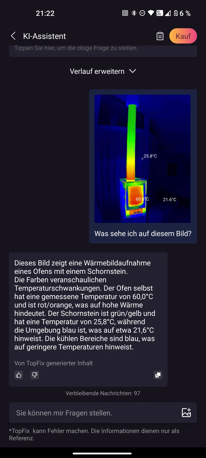 Deutlich größer ist der Funktionsumfang mit Topinfrared. Der App für Android und iOS zur Wärmebildkamera. Hier finden sich extrem viele Funktionen für das Erstellen und Bearbeiten von Wärmebildern, sowie Anleitungen und Möglichkeiten zum Erstellen von Berichten. Die App bietet sogar einen KI-Assistenten, der in bestimmten Anwendungsfällen hilfreich sein kann. TopFix kann Schädlinge, Lecks, Schaltkreise und Hotspots erkennen. Hierfür ist allerdings ein Nutzerkonto erforderlich, die KI ist cloudbasiert. Nach der Anmeldung stehen 100 Antworten vom Chatbot zur Verfügung. Noch befindet sich die KI im Beta-Stadium, Token können nicht nachgekauft werden.