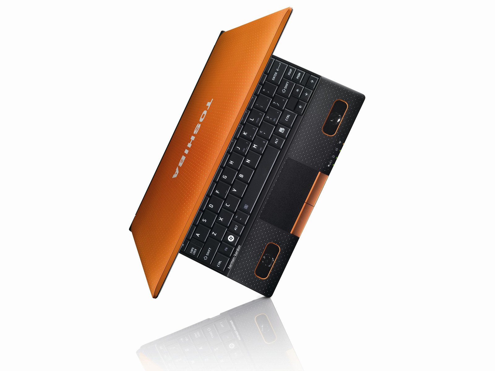 Als „mobile sound machine“ bezeichnet Toshiba das neue NB520 Netbook mit 10,1-Zoll-Bildschirm (1024 x 600 Pixel, Glare-Type) und zwei Lautsprechern (jeweils 2 Watt) von der amerikanischen Firma Harman Kardon. Beide Speaker befinden sich interessanter Weise im Bereich der Handballenauflage und damit in einem ergonomisch wichtigen Bereich. Ob die Wiedergabe von Musik bei gleichzeitiger Nutzung der Tastatur eingeschränkt ist, werden die ersten Testberichte klären müssen. Eine weitere Besonderheit ist das gummierte Oberflächenfinish des Gehäuses. Dieses wird vorerst in Orange und Blau verfügbar sein, aber Modelle in Grün (Lime Green) und Türkis sollen folgen. Das Einsteiger-Modell Toshiba NB500 wird nur in Schwarz erhältlich sein und kein hochwertiges Lautsprecher-System beherbergen.