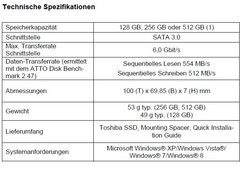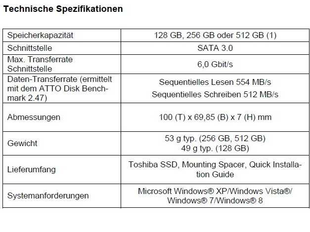 Toshiba nennt für die Q Series Pro (SATA 3) Transferraten bis zu 6 Gbit/s und Geschwindigkeiten von bis zu 554 MB/s beim Lesen, respektive 512 MB/s für das Schreiben von Daten.