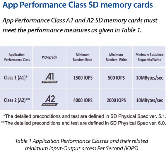 Mit der im November 2016 durch die SD Association (SDA) eingeführten App Performance Class (APC) A1 wird SD-Speicherkarten eine Mindestleistung für Apps bescheinigt. Dies soll Nutzern unter anderem eine Orientierung zur Leistung der verwendeten SD-Karte als Adoptable Storage Device geben, wodurch sich Apps nicht nur auf dem internen Gerätespeicher installieren und auszuführen lassen, sondern auch auf SD-Karten. Ende Februar 2017 hat die SDA die zweite Stufe der App Performance Class für SD-Speicherkarten als A2 hinzugefügt.