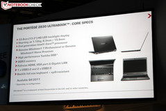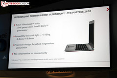 Das Portégé Z830 auf der IFA 2011 ist noch ein Vorseriengerät, das beispielsweise mit einem stromsparenden Intel Core i5-2557M Dual-Core Prozessor ausgestattet werden könnte. Der Bildschirm löst mit den üblichen 1366 x 768 Pixel im 16:9 Format auf und kommt mit einer hochglänzenden Oberfläche, wobei auch eine matte Variante zur Verfügung stehen soll. Das Gewicht von nur 1,12 Kilogramm und die Bauhöhe von 8,3 bis 15,9 Millimeter kann sich sehen lassen. Das Gegenstück von Apple ist mit maximal 17 Millimetern ein wenig dicker an der Hüfte.