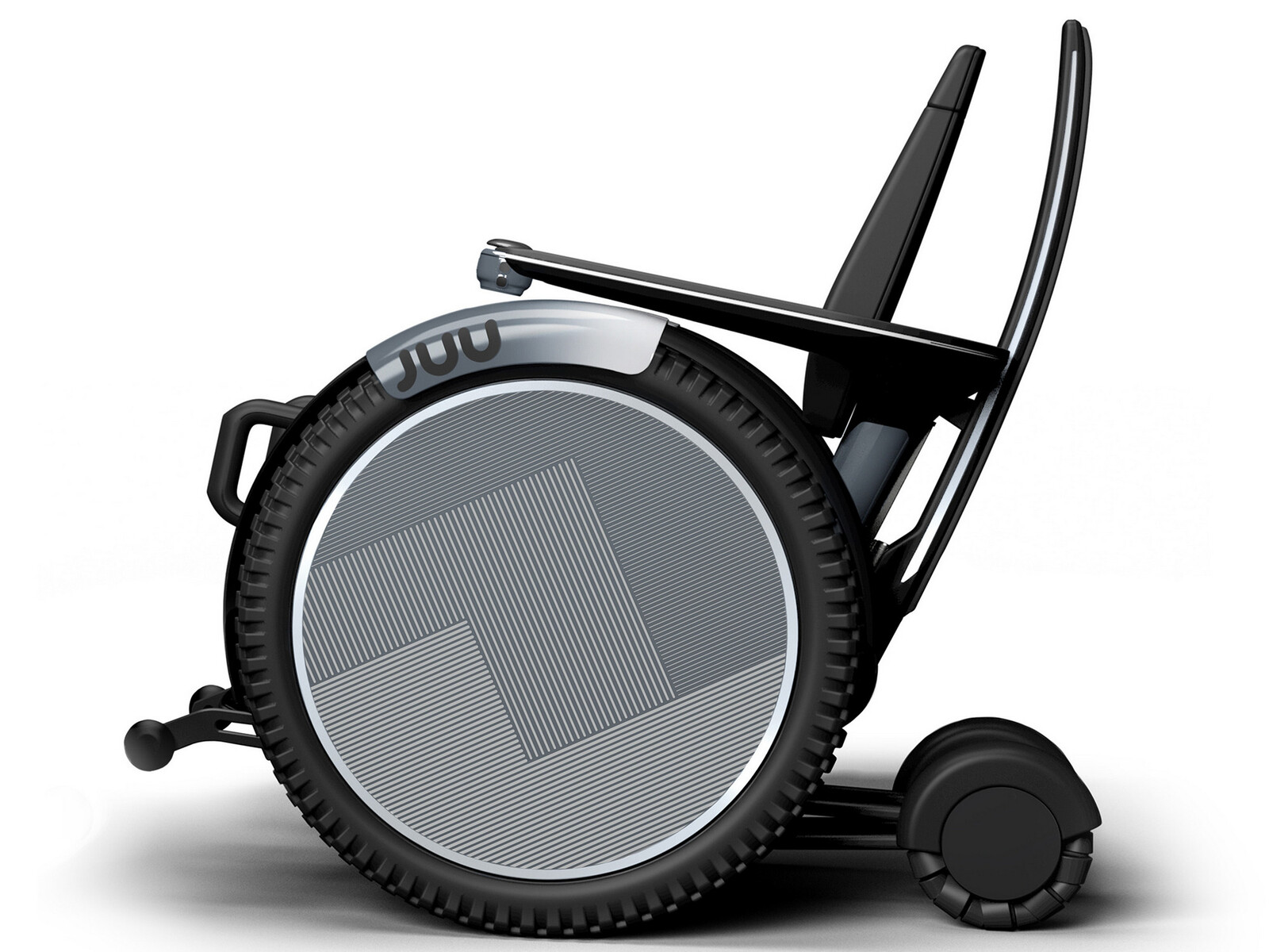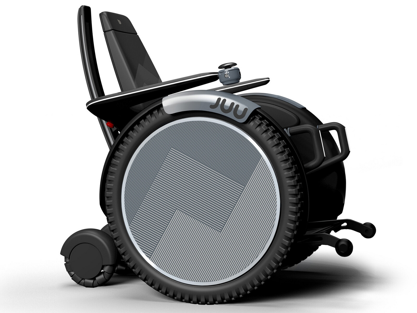 Der JUU ist ein vollelektrischer Rollstuhl, der Stufen selbstständig überwinden kann. Er verfügt über ein einziehbares Heck, das sich beim Hinauf- oder Hinunterfahren einer Treppe nach unten klappt, um den Rollstuhl zu stabilisieren.