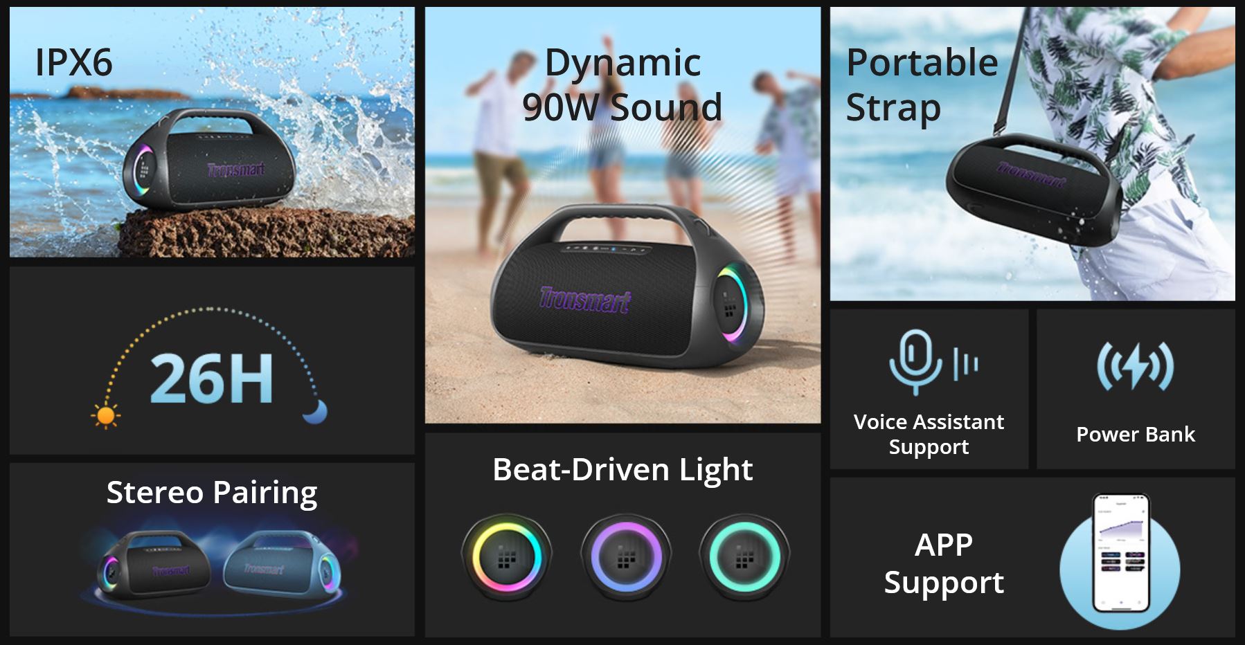 Mit nun bis zu 26 Stunden wartet der Tronsmart Bang 2 mit einer deutlich längeren Spielzeit auf als die erste Generation, lädt zudem auch etwas schneller via USB-C. Optional kann der Bluetooth-Lautsprecher als Powerbank genutzt werden. Dazu runden Bluetooth 5.3, Unterstützung von Sprachassistenten, App-Steuerung sowie Lichteffekte an den Seiten passend zur Musik die Ausstattung des Bang 2 von Tronsmart ab.