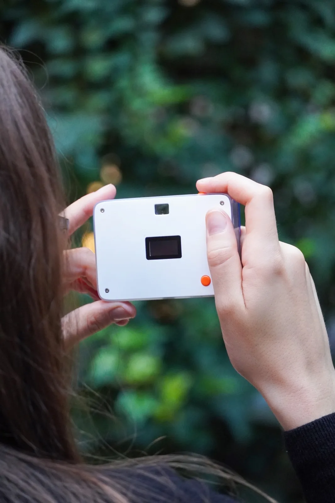 Die Await Camera erinnert auf den ersten Blick am ehesten an eine analoge Einwegkamera, denn die Vorderseite beherbergt neben einem kleinen Objektiv lediglich einen optischen Sucher und einen Blitz. Auf der Rückseite ist ein kleines Display zu sehen, das Informationen zum Akku, zu den auf der "Filmrolle" verfügbaren Fotos und zum Verbindungsstatus mit der zugehörigen Smartphone-App anzeigt.