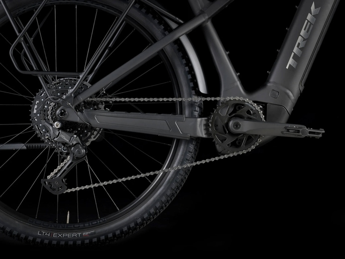 Genutzt wird der Bosch Smart System Performance Line CX BDU38-Mittelmotor mit einem Drehmoment von 85 Nm. Gespeist wird dieser Motor von einem mit 800 Wh großzügig bemessenen, in den Rahmen integrierten Akku. Dabei ist der Akku nicht fest integriert, sondern kann entnommen werden. Verbaut ist ein Bosch Purion 200 und damit ein eher kompaktes Display. Die Nutzung eines kompakteren Displays ist dabei für E-Mountainbikes nicht untypisch, beim Trek Powerfly+ 4 EQ 800 2026 lässt sich ein zweites Display einbinden.