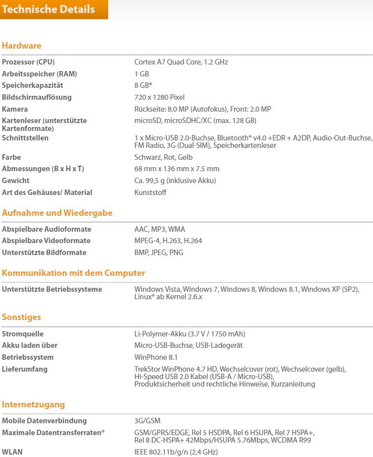 Praktisch: Das TrekStor 3G/UMTS-Smartphone WinPhone 4.7 HD bietet eine Dual-SIM-Unterstützung. Als Anschlüsse und Schnittstellen sind WLAN 801.11 b/g/n, Bluetooth 4.0 + EDR, 1x micro-USB-2.0 sowie eine 3,5-mm-Soundbuchse vorhanden. Der Lithium-Polymer-Akku hat eine Kapazität von 1750 mAh. Das schwarzfarbene Smartphone wird inklusive zwei beiliegender Wechselcover in Rot und Gelb geliefert.