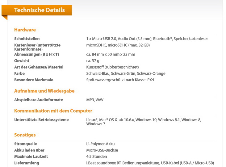 Eine Öse und ein praktisches Trageband ermöglichen die Befestigung am Rucksack oder Fahrrad. Wer den TrekStor i.Beat soundboxx BT als MP3-Player (MP3, WAV) mit Kopfhöreranschluss nutzt, der braucht dank des integrierten microSD-Kartenslots weder das Smartphone noch eine andere externe Audioquelle. Der eingebaute Lithium-Polymer-Akku soll dem i.Beat soundboxx BT mit einer Batterieladung rund 4,5 Stunden lang Energie spenden.