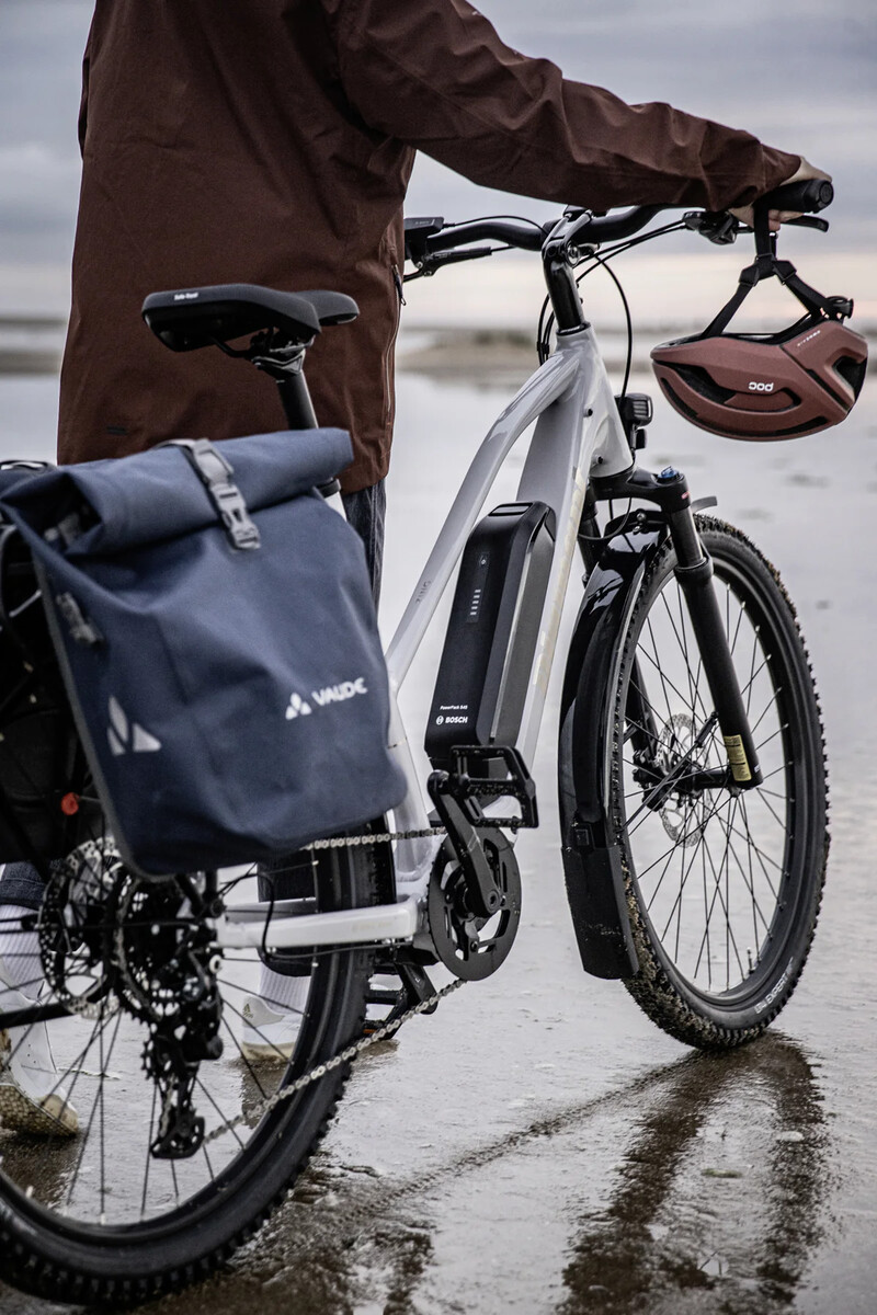Der Akku ist im Aluminiumrahmen des Zing Gen 3 integriert. Dieser präsentiert sich mit hydrogeformten Rohren sowie 20 Prozent weniger Gewicht als beim Vorgänger und steht mit verschiedenen Einstiegshöhen zur Wahl. Je nach Ausführung wiegt das E-Bike mit 545 Wh um die 23 kg. Neben interner Zugführung wartet der Rahmen bei tiefem Einstieg mit einem Tragegriff sowie beim mittleren und tiefen Einstieg einer seitlichen Aufnahme einer Trinkflasche auf. Gefahren wird auf 65 mm breiten Reifen von Schwalbe, für Sicherheit sorgen ein Apple AirTag oder das Bosch ConnectModule direkt im Motorgehäuse.