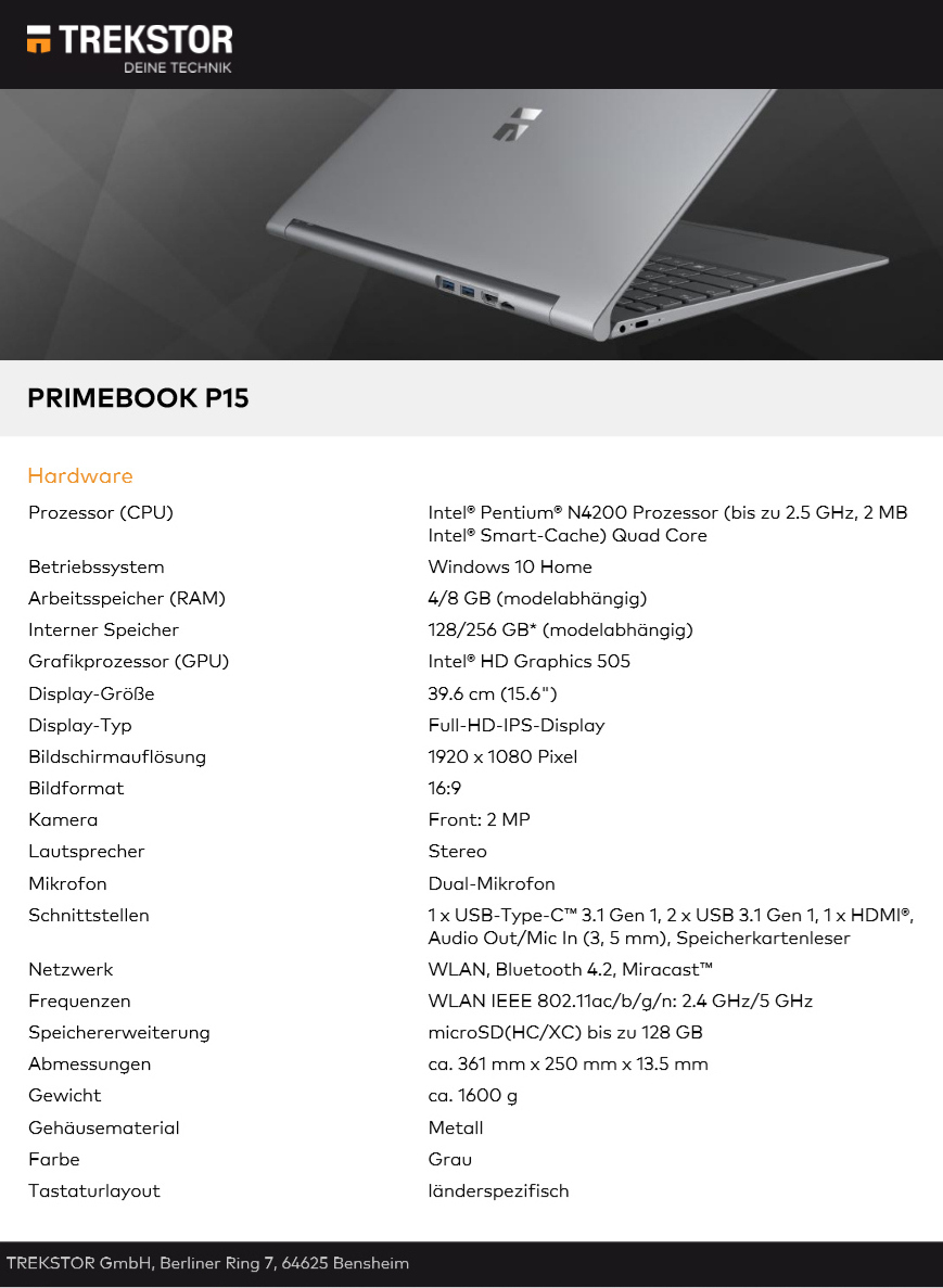 Trekstors Primebook P15 bietet als Schnittstellen unter anderem einen USB-Typ-C 3.1-Gen1-Port, zwei USB-3.1-Gen1-Anschlüsse, HDMI, Audio-Out, Mic-In und einen eingebauten Speicherkartenleser sowie Fingerabdrucksensor. Zum Featureset zählen auch eine integrierte 2-MP-Webcam, Dual-Mikrofon, Stereolautsprecher, WLAN 802.11ac, Bluetooth 4.2 und ein 5000-mAh-Akku. Das Primebook P15 wird mit vorinstalliertem Microsoft-Betriebssystem Windows 10 Home geliefert
