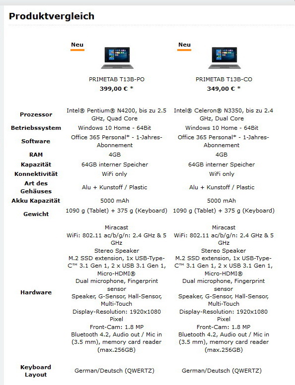 TrekStor ergänzt sein Primetab T13B (T13B-PO) mit Intel Pentium N4200 Quadcore-Prozessor der Generation Apollo Lake, das zu einem Preis von knapp 400 Euro (UVP) angekündigt wurde, um ein etwas günstigeres Detachable-Modell mit der Bezeichnung Primetab T13B-CO.
