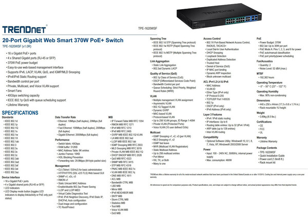 Die 4 dezidierten Shared-Gbit-Steckplätze unterstützen auch SFP-Module für Glasfaser-Netzwerkanwendungen über weite Strecken. Dank der PoE-Technologie benötigen Anwender nur einen Kabelsatz, um sowohl Daten als auch Strom zu liefern. So können Installateure und Integratoren mit dem Trendnet TPE-1620WSF erhebliche Gerätekosten sparen und die Installationszeit reduzieren. Die PoE+-Gesamtleistung von 370 Watt auf dem TPE-1620WSF versorgt bis zu 16 angeschlossene Power-over-Ethernet-Geräte mit bis zu 30 Watt pro Port.