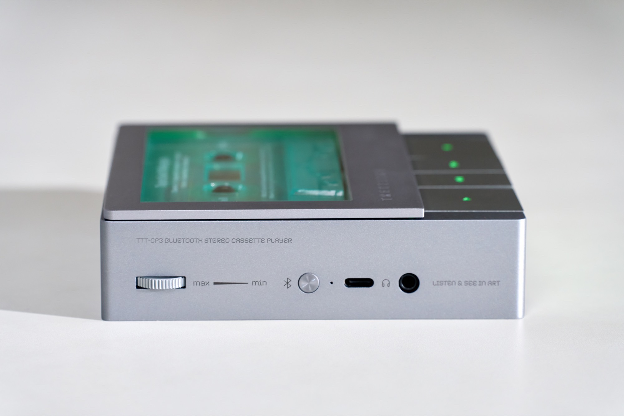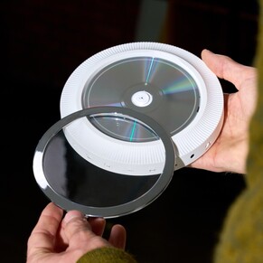 Der kompakte CD-Player besitzt ebenfalls einen Akku, die runde Vorderseite kann zur Seite gedreht werden, um die CD zu wechseln. Ein winziges OLED-Display zeigt Details zur Wiedergabe und zum Akku an. Der CD-Player wird genau wie der Kassetten-Player über USB-C geladen, alle Komponenten setzen auf ein hochwertiges Metallgehäuse und bieten sowohl Bluetooth als auch AUX.