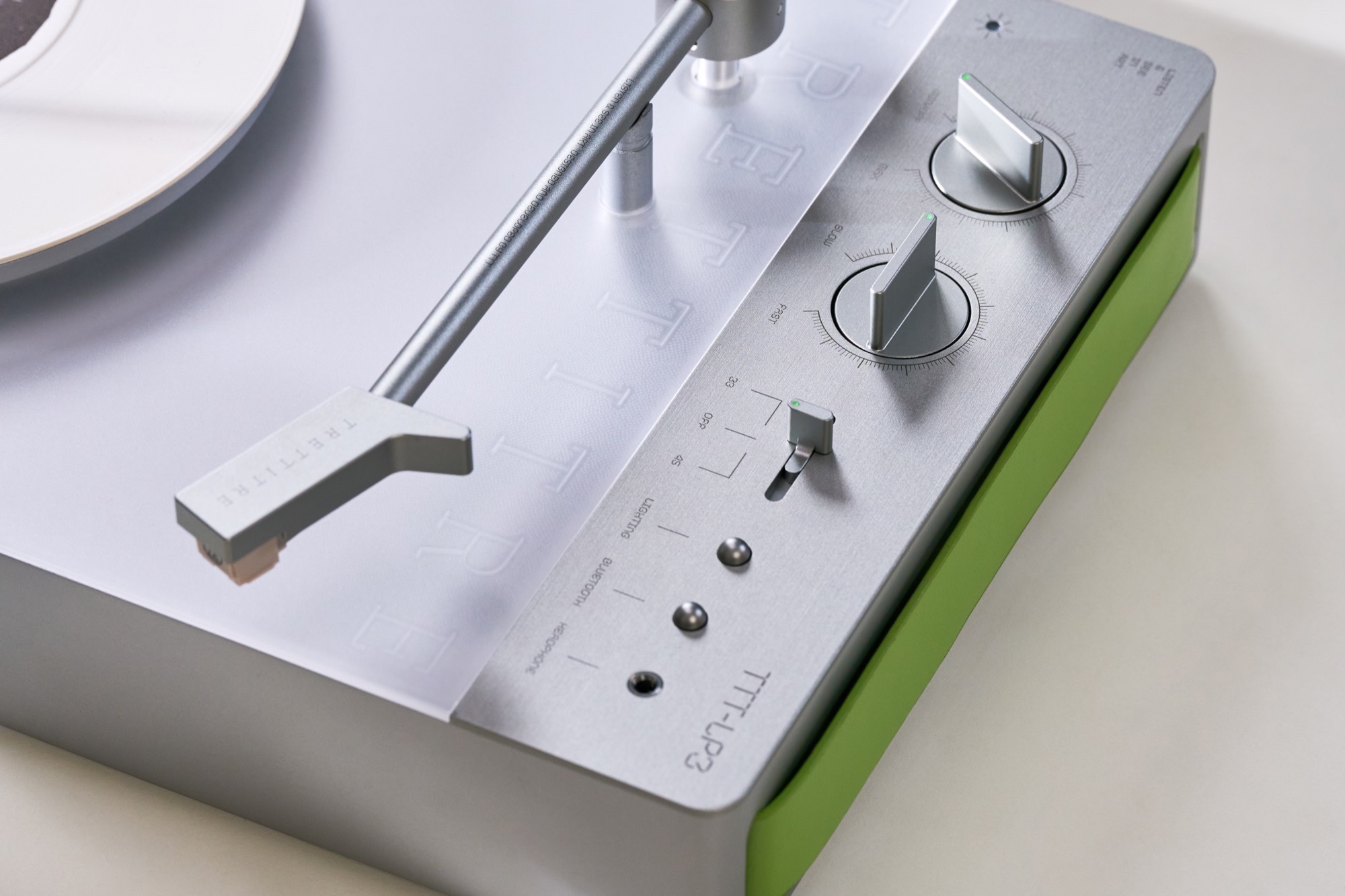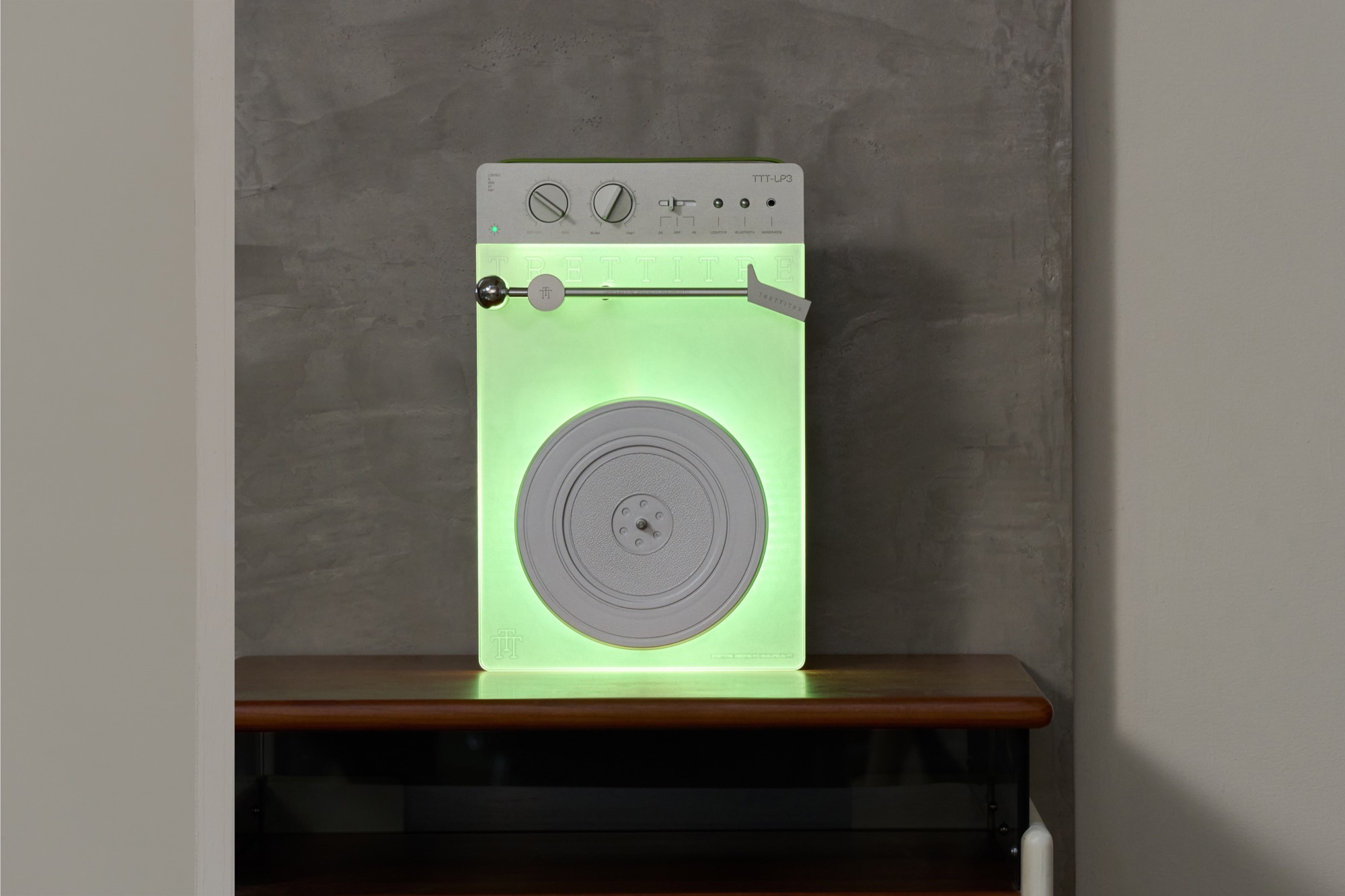 Dieser Trettitre TTT-LP3 Plattenspieler ist drahtlos und mit einem Akku ausgestattet. Es ist möglich, sowohl vertikal an der Wandhalterung, als auch horizontal auf einem Tisch Schallplatten abzuspielen. Der Ton kann drahtlos per Bluetooth 5.3 an einen Lautsprecher oder Kopfhörer übertragen werden, inklusive Support für Qualcomm aptX HD. Alternativ steht ein Klinkenstecker zur Verfügung. Die Wandhalterung lädt den Player, der integrierte Akku erreicht eine Laufzeit von bis zu sechs Stunden.