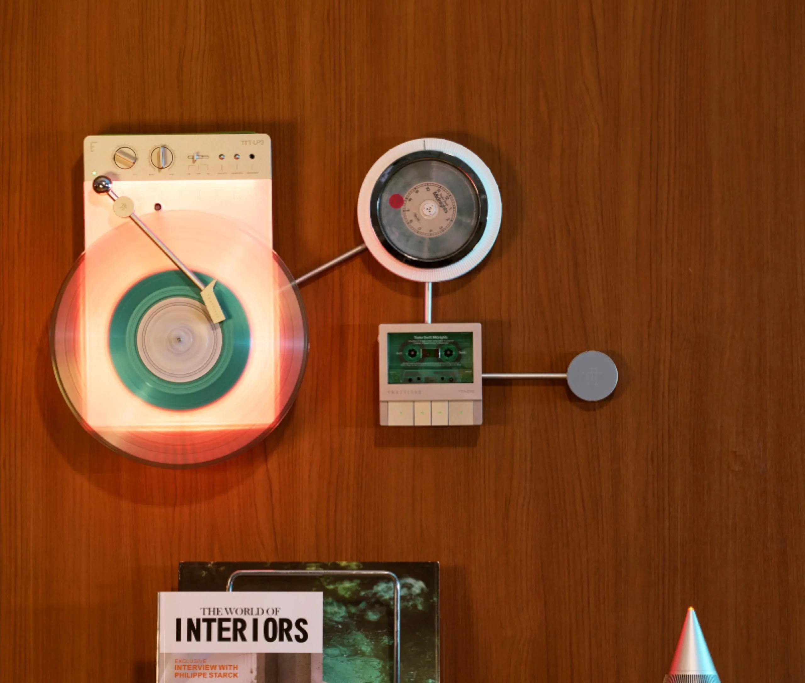 Diese Wandhalterung kann auch ein Smartphone wie das Apple iPhone 17 (ca. 899 Euro auf Amazon) magnetisch halten. Das System besteht darüber hinaus aus drei Abspielgeräten, die Schallplatten, CDs und Kompaktkassetten abspielen können. Der Plattenspieler ist das klare Design-Highlight, denn dieser setzt auf eine beleuchtete Oberfläche, welche Vinyl gekonnt in Szene setzt.