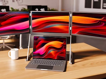 Wir haben an dieser Stelle bereits mehrmals über auch portable Systeme mit mehr als einem Display berichtet. Beim TriCreate handelt es sich nun - angesichts des Namens nicht wirklich überraschend - um ein Modell mit drei einzelnen Bildschirmen. Dabei sind die beiden links und rechts vom mittigen Bildschirm angebrachten Displays über Scharniere drehbar. Der Vorteil: Die Positionierung ist flexibel möglich. So kann nicht nur der eigene Arbeitsbereich doch stark erweitert, stattdessen kann auch etwa eine Präsentation an einem Tisch gehalten werden. Dabei können bei einer Aufstellung als Dreieck dank Magnete die beiden äußeren Bildschirme auch aneinander haften.
