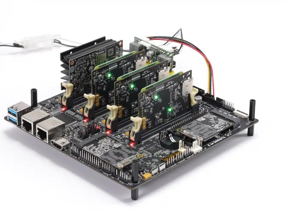 Die Rechenplatine unterstützt dabei bis zu vier einzelne Platinen. Die Energieversorgung erfolgt über einen 24-Pin-ATX-Stecker. Es stehen zwei SATA 3-Anschlüsse zur Verfügung, dazu kommen zwei USB 3.0-Anschlüsse und zweimal Ethernet. Die Nutzung einer microSD-Karte ist möglich. Es können bis zu vier M.2 2280-SSDs installiert werden, damit lassen sich auch schnelle SSDs anbinden. Ein Mini-PC-Anschluss ist ebenso vorhanden wie ein SIM-Kartenslot. Damit könnte sich ein entsprechendes Cluster-System auch abseits fester Internetanschlüsse nutzen lassen. Vorbestellbar ist das System zu einem Preis von 259 Dollar.