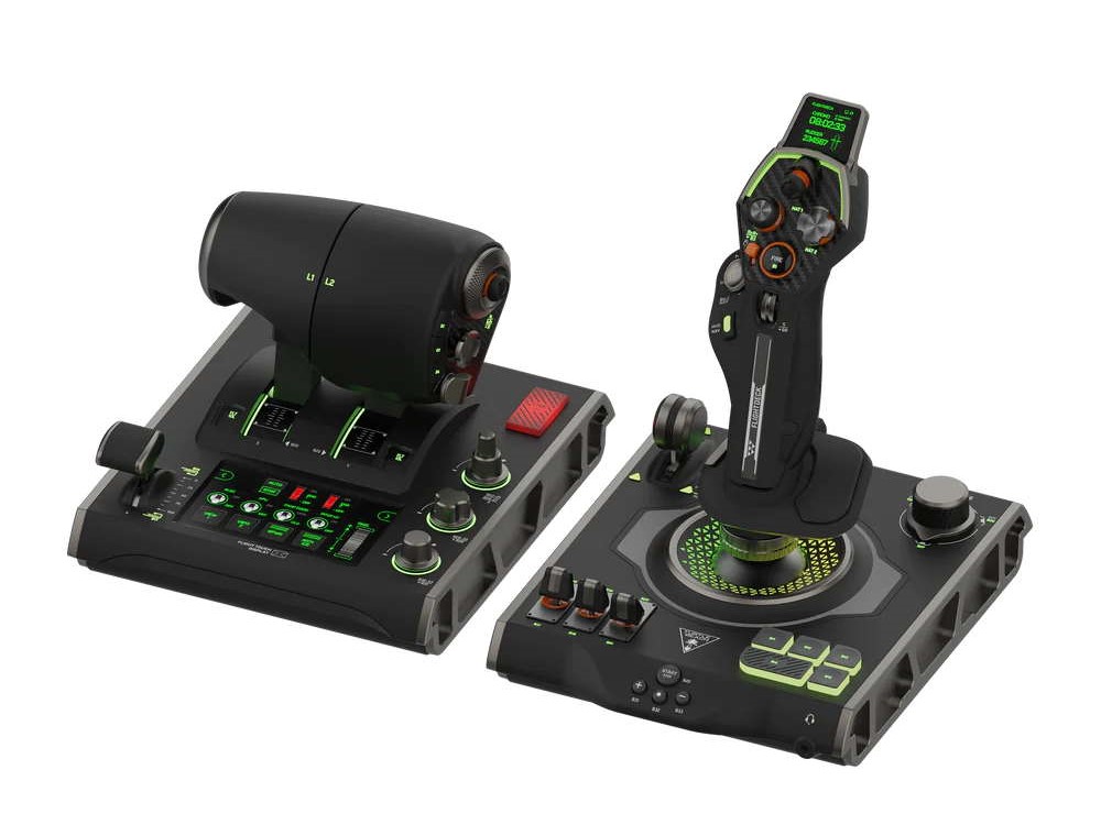 Die Turtle Beach Flight Hangar-App verspricht zusätzliche Produktfunktionen und auch die Möglichkeit zur Anpassung der Eingabe an die eigenen Vorlieben. Eine große Neuerung: Vorhanden ist ein OLED-Head-Up-Display, welches kritische Parameter direkt anzeigen kann und auch ein Touchscreen ist vorhanden. Dieses die Anzeige weiterer Bedienelemente oder etwa die Steuerung von Kamerawinkeln. Allein auf dem OLED lassen sich dabei bis zu 39, zusätzliche Tastenfunktionen konfigurieren. Die Steuerbefehle müssen dabei anscheinend alle nicht auf einer einzelnen Bildschirmansicht untergebracht werden.