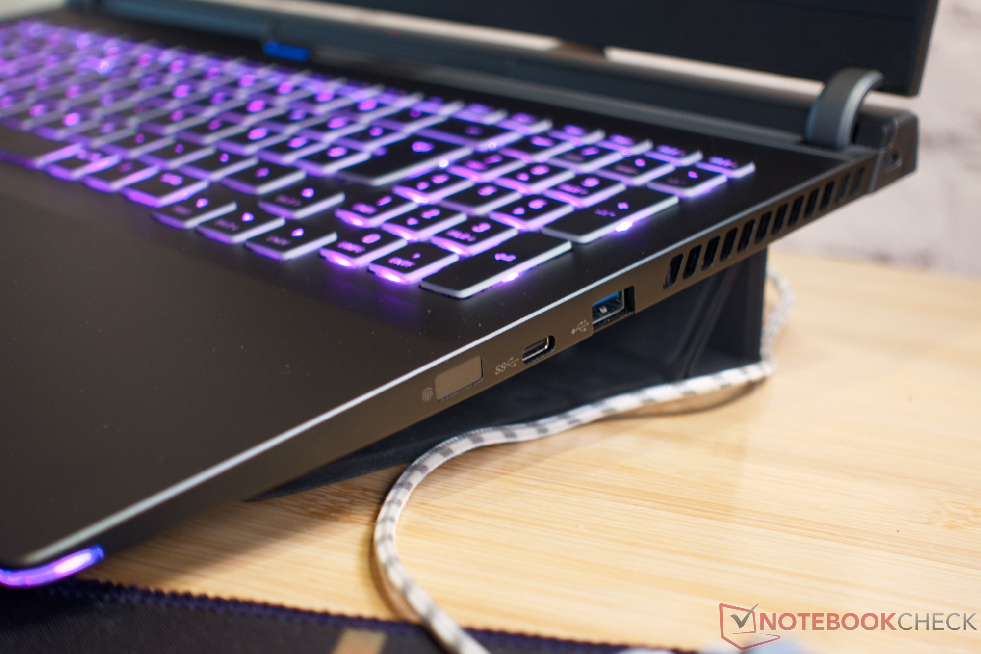 Der Gaming-Laptop zeigt sich bei der Anschlussauswahl vielfältig. Interessant ist, dass externe Monitore, je nach gewähltem USB-C-Anschluss, sowohl an die iGPU des AMD Ryzen 7 7840HS als auch an die RX 7600M XT angeschlossen werden können. Vermissen könnte man hier nur einen Kartenleser oder einen optischen Ausgang für Audio.