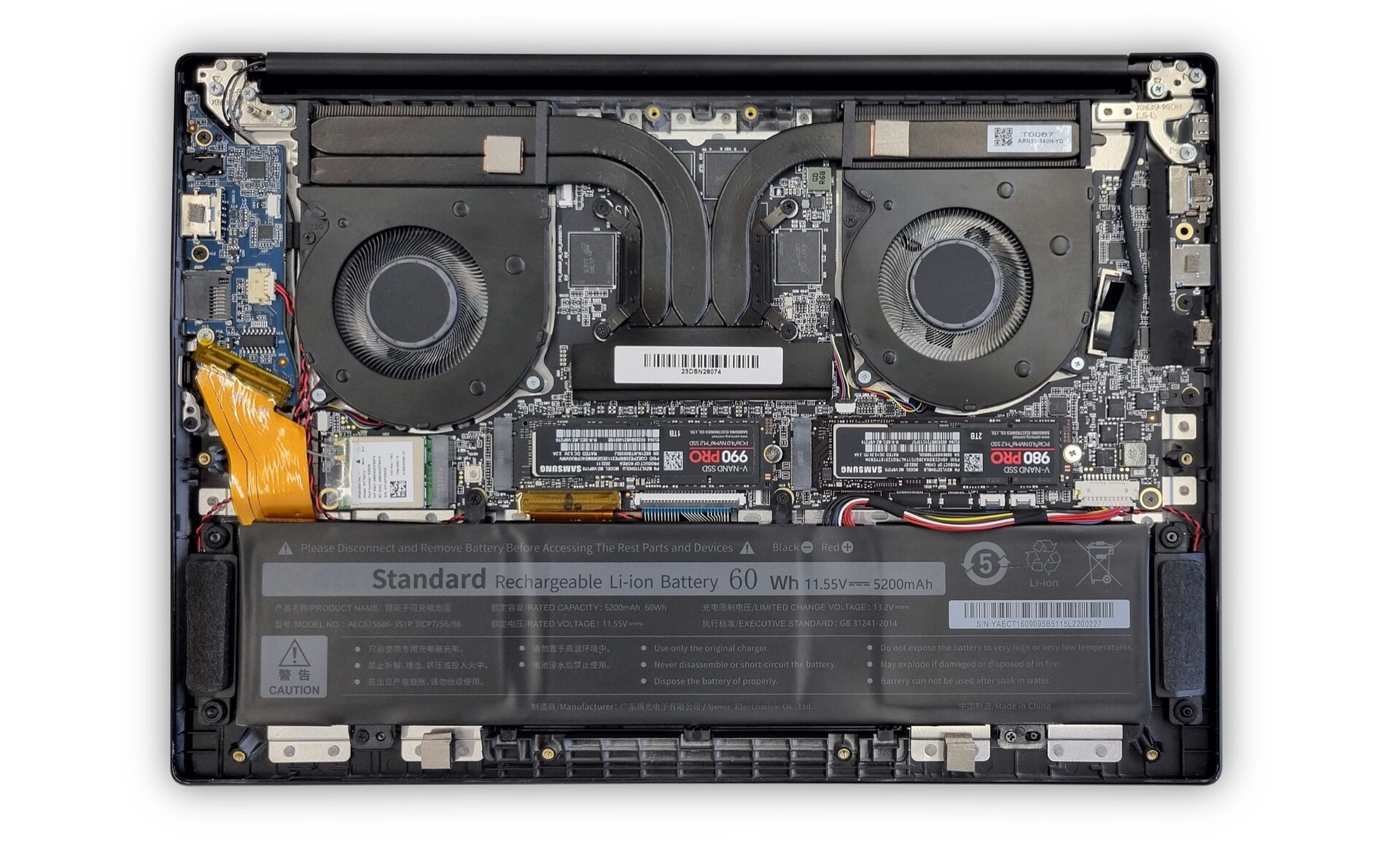 Der Arbeitsspeicher ist zwar fest am Mainboard verlötet, immerhin besitzt aber schon das Basismodell 32 GB LPDDR5x-6.400-RAM. Zusätzlich zur mindestens 500 GB großen SSD können Nutzer nach dem Kauf eine zweite M.2-SSD verbauen, um den Speicher zu erweitern. Bluetooth 5.3, Wi-Fi 6, eine 720p-Webcam, 2 x 1 Watt Stereo-Lautsprecher und eine beleuchtete Tastatur gehören zur Standardausstattung. Das Notebook besitzt zwei USB-C-Anschlüsse (10 Gbit/s), zweimal USB-A (5 Gbit/s), HDMI 2.0 und einen microSD-Kartenleser.