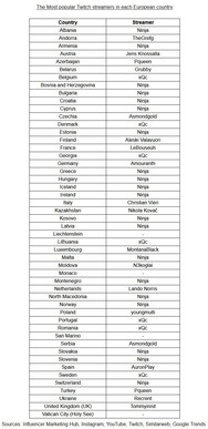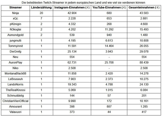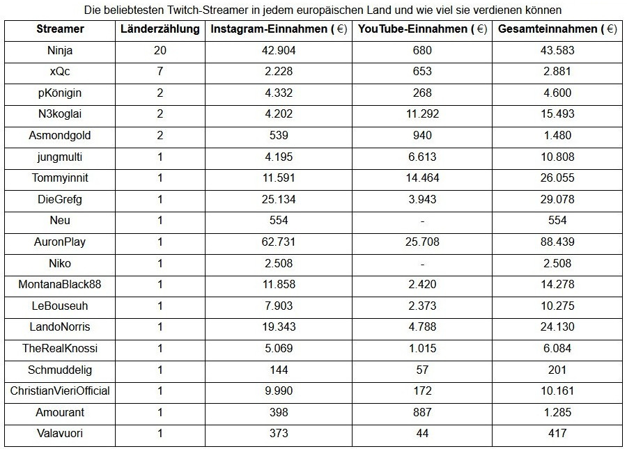 Laut verschiedenen zugänglichen Quellen ist Ninja der aktuell beliebteste Twitch-Streamer in Europa. Ninja hat den beliebteste Twitch-Kanal in 20 europäischen Ländern, also in fast drei Vierteln von ganz Europa. Die bevölkerungsreichsten Länder in Europa, die am häufigsten nach Ninja suchen, sind Griechenland, Ungarn, die Schweiz und Bulgarien.