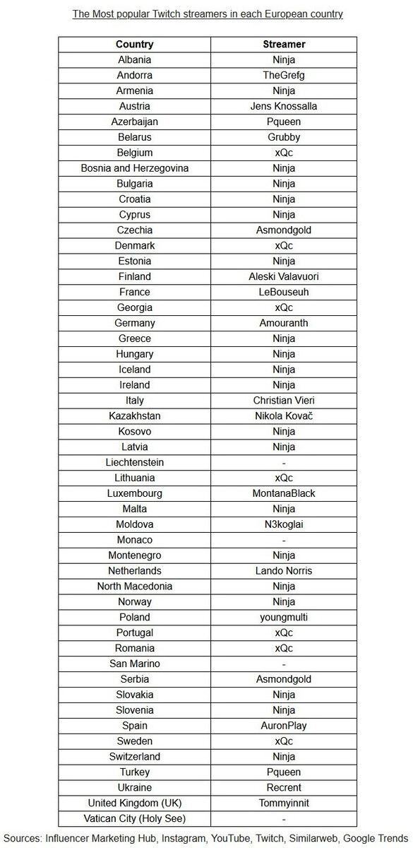 Der in Kanada geborene Streamer Félix Lengyel aus Kanada ist der zweitbeliebteste Twitch-Streamer in der Rangliste. In sieben europäischen Ländern wird nach xQc, seinem Kanalnamen, mehr als nach jedem anderen Streamer gesucht, darunter Belgien, Dänemark, Georgien, Litauen, Portugal, Rumänien und Schweden. Lengyels geschätzte Einnahmen für einen gesponserten Social-Media-Beitrag auf Instagram und YouTube belaufen sich zwar nur auf 2.881 Euro pro Sponsored Post, das Gesamteinkommen von xQc mit alleine 11,4 Millionen Subscriptions auf Twitch liegt allerdings viel höher.