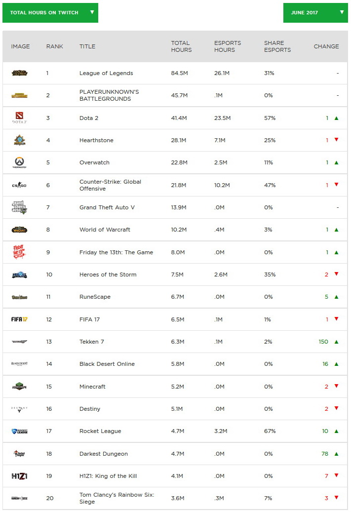 Playerunknown's Battlegrounds ist bei den "Total Hours on Twitch" mit 45,7 Millionen eine Bank und auf Platz 2 der beliebtesten Games - noch vor CS:GO und Dota 2. Counter-Strike: Global Offensive (CS:GO) kommt bei den eSports Hours mit 10,2 Millionen Stunden auf Platz 3. Das geht vor allem auf das Konto der PGL Asia, America, and Europe Minors und der Major-Qualifikationen sowie der Dreamhack: Summer. Hearthstone landet mit dem SeatStory Cup VII und den laufenden Hearthstone Global Games bei den Gesamtstunden auf Rang 4, bei den eSports Hours ebenfalls auf Position 4.