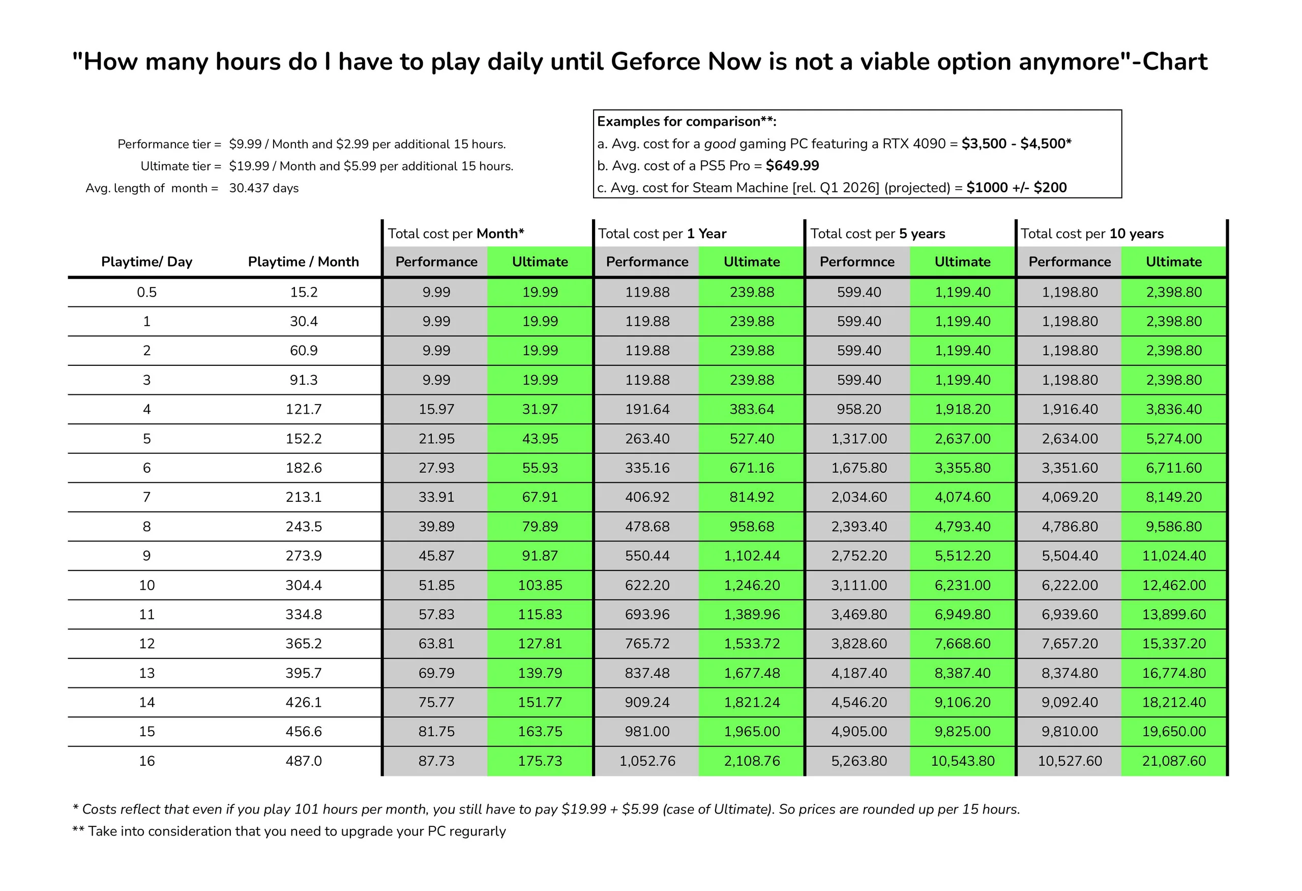 GeForce Now Priority für 1.440p-Gaming kostet regulär 10,99 Euro pro Monat, sind die 100 im Abo enthaltenen Stunden aufgebraucht, veranschlagt Nvidia zusätzlich 2,85 Euro für ein Paket mit 15 weiteren Stunden. Das GeForce Now Ultimate Abo, welches die Leistung einer Nvidia GeForce RTX 5080 (ca. 1.160 Euro auf Amazon) bieten soll, kostet 21,99 Euro, Pakete mit 15 Spielstunden werden für 5,75 Euro an Abonnenten verkauft. Wie die unten eingebettete Tabelle eines Reddit-Nutzers zeigt, kann es sich durch dieses neue Preismodell schnell lohnen, statt des Abos einfach eine Grafikkarte zu kaufen – einen PC samt Monitor und Zubehör benötigt man für GeForce Now schließlich ohnehin.