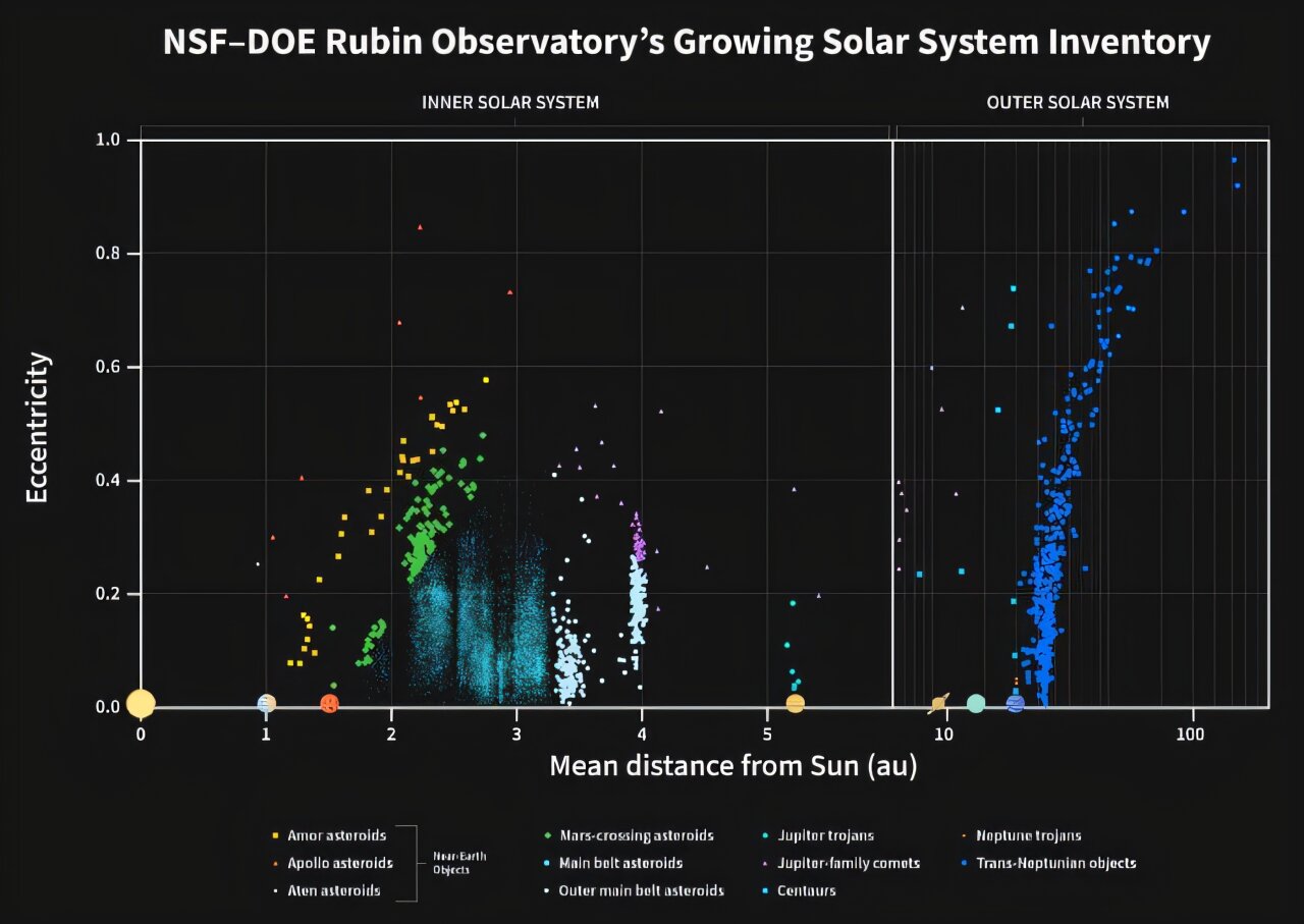 Das im Juni 2025 in Chile in Betrieb genommene Vera C. Rubin Observatory ist in der Lage, zahlreiche Himmelsobjekte im Universum aufzuspüren. Mithilfe vorläufiger Daten konnten Astronomen bereits mehr als 11.000 neue Asteroiden in unserem Sonnensystem identifizieren. Es wurden über eine Million Beobachtungen durchgeführt, insbesondere an mehr als 80.000 bereits bekannten, aber noch rätselhaften Asteroiden.