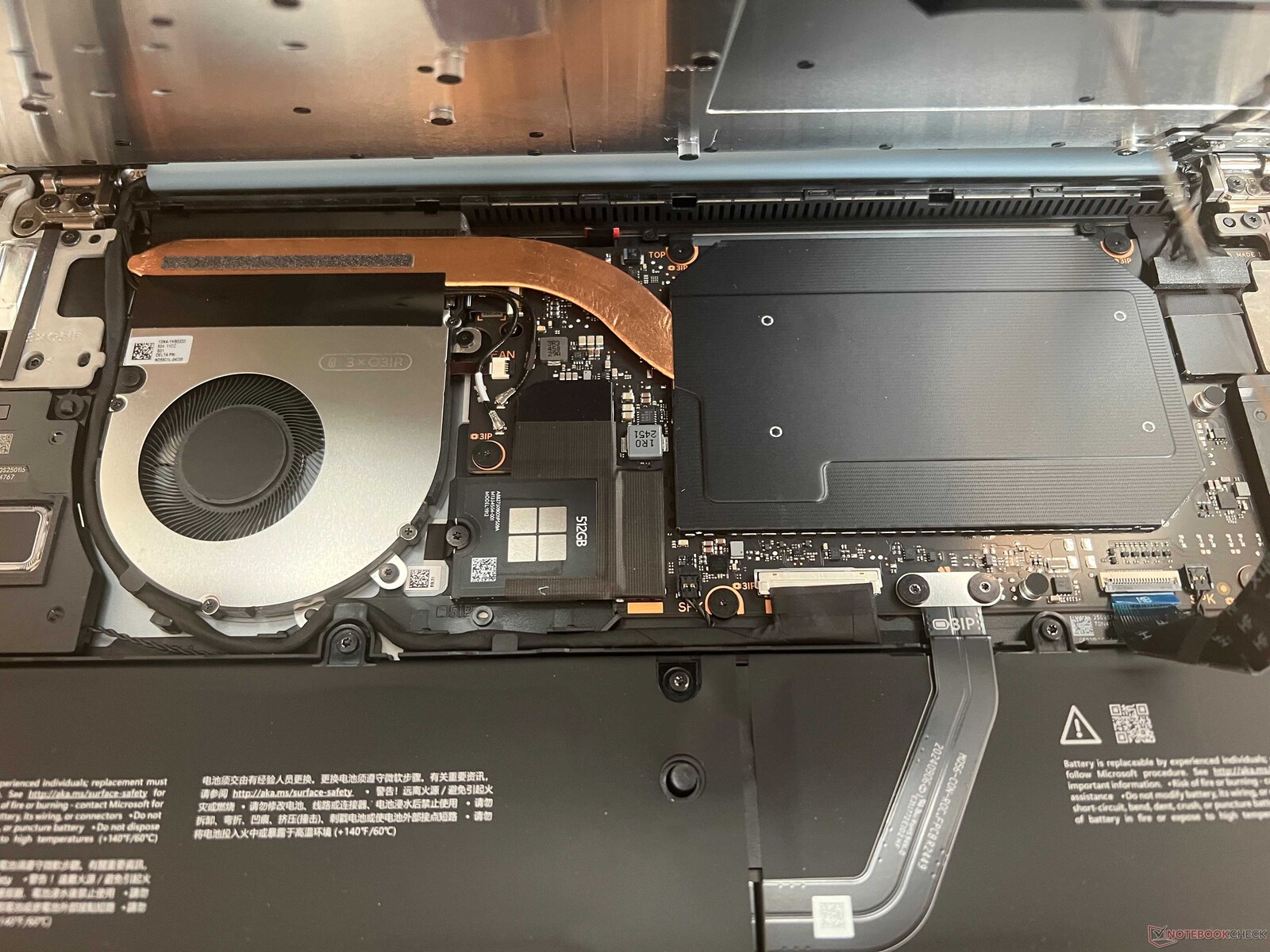 Mit den offiziellen Reparaturanweisungen von Microsoft haben wir noch einmal versucht, das Gehäuse zu öffnen und waren im Endeffekt auf erfolgreich. Nach dem Entfernen der Schrauben muss man mit mehreren Spudgern versuchen, die Oberseite der Baseunit anzuheben. Diese kann dann nach vorne geklappt oder nach dem Entfernen eines Datenkabels auch komplett abgehoben werden. Nun können wir auch einen Blick auf die Kühlung sowie den austauschbaren UFS-Speicher werfen, wobei hier noch zusätzliches Klebeband zum Einsatz kommt. Nachdem Microsoft die Wartungsmöglichkeiten bzw. den Zugang zu den Komponenten bei den anderen Surface-Laptop-Modellen verbessert hatte, ist das nun wieder ein ganz klarer Rückschritt.